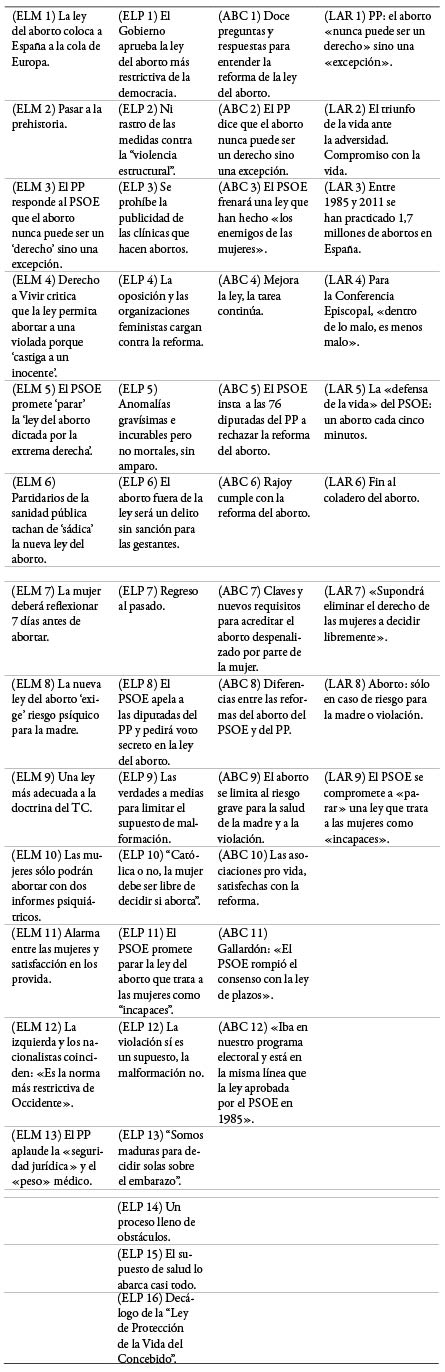 El Mundo y El País hacen una evaluación de la ley desde dos ángulos opuestos. Uno alaba la legalidad de la reforma: Una ley más adecuada a la doctrina del TC (ELM 9) y el otro la cataloga como la norma más restrictiva desde 1978: El Gobierno aprueba la ley del aborto más restrictiva de la democracia (ELP 1). Estas mismas palabras las recoge El Mundo en el siguiente titular: La izquierda y los nacionalistas coinciden: «Es la norma más restrictiva de Occidente» (ELM 12). La credibilidad de la esquematización se ha conseguido en este caso por medio de una operación de apropiación (cita textual).