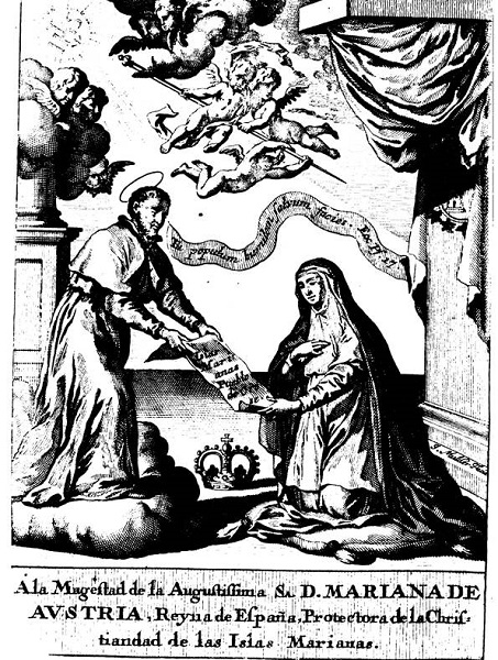 A fines del siglo XVII aparece, en la ya decadente Sevilla, un grabado holandés de exaltación de la exregente Mariana de Austria, no solo como propulsora de la cristianización jesuítica de las islas Marianas, así llamadas en su honor, sino también como garante del desdoblamiento habsbúrgico-católico del martirio, en título de legitimación de la conquista.