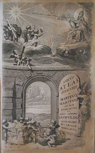 Ya estaba difundida la escenográfica imagen tardobarroca del rayo partido o multiplicado, no exclusiva de la orden. La luz irradiada por el nombre de Jesús proporciona el argumento de una estampa que adorna la portada del Novus atlas sinensis, del jesuita italiano Martino Martini, publicado en Ámsterdam en 1655, obra inseparable de los afanes misionales de la Compañía (Figura 5).42 De la imagen cristológica del sol, a la izquierda, sale un rayo que, tras dar en un espejo portado por una figura femenina con atuendo pontificio, se refracta contra una antorcha, símbolo de cómo la fe abraza los corazones de los fieles (Doménech-García, 2012: 334 ).
