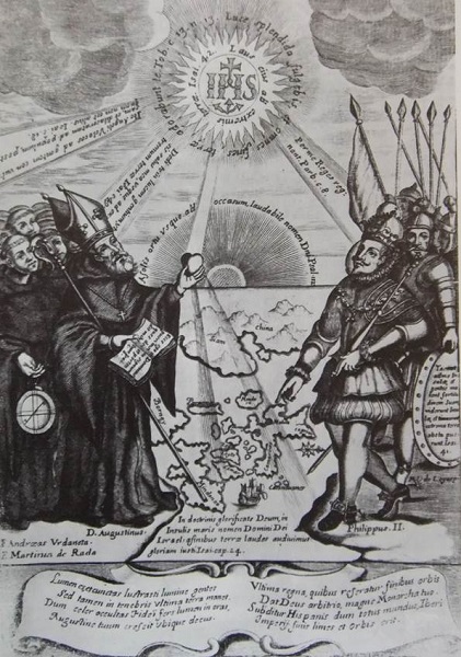 El ámbito geográfico y cultural donde se insertan las islas Marianas, es decir, el de las Filipinas, también conoce el manejo retórico del rayo para ilustrar la gloria de la cristianización. Una estampa del libro de fray Gaspar de San Agustín, Conquista de las Islas Philipinas: la temporal por las armas del señor Don Phelipe Segundo el Prudente; y la espiritual, por los religiosos del Orden de Nuestro Padre San Augustin: Fundacion, y progressos de su provincia del Santissimo Nombre de Jesus, publicado en Madrid, en 1698, muestra sobre el mapa del territorio un sol naciente, por encima del cual otro sol, con el anagrama de Jesús, da en un corazón que lleva en la mano san Agustín, y cómo el rayo, refractándose, se divide en otros dos que caen sobre el archipiélago, complejo asunto flanqueado por dos grupos de personajes, el profano, a la derecha, con Felipe II y tras él Miguel López de Legazpi, y el religioso, con dos de los frailes que acompañaron al conquistador (Figura 6) (Aa.Vv., 1993: 155-156, n. 132, ficha de Fernando Bouza). Detalle un tanto excesivo de humillación regia ante un venerable padre de ínfimo rango en el universo sobrenatural católico, y quien, por otra parte, representa directísimamente los intereses de una determinada orden conventual que interactúa con el imperio en una empresa de conquista; el de la corona en el suelo puede ser capricho del grabador Mulder, signo genérico de humildad devota. Pero objetivamente indica renuncia a los poderes mundanos, como se ve, por ejemplo, y ejemplo insigne, en la pintura dinástica por excelencia, La gloria, de Tiziano, de 1551-1554.43