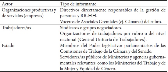 En términos de los participantes en este estudio, se identificaron tres grupos de actores relevantes para la discusión sobre políticas de conciliación trabajo-familia, utilizando el criterio de selección de informantes estratificado intencional, que busca identificar a participantes de diferentes estratos de un mismo colectivo social (Izcara, 2014) y que se resumen en el Cuadro 1.7