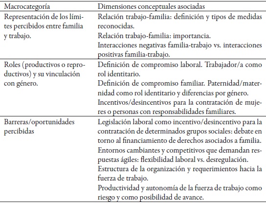 El análisis del corpus representado por las entrevistas privilegió identificar y comparar tres ejes discursivos, definidos grosso modo, como: a) la necesidad percibida de implementar reformas laborales que faciliten la conciliación familia-trabajo, y las razones que las justifican; b) la necesidad de que estas políticas fomenten la corresponsabilidad, en los términos definidos con anterioridad en este texto; y c) las oportunidades/barreras percibidas para implementar políticas que faciliten la conciliación familia-trabajo. Para ello, se utilizó un proceso de categorización abierta primero y estructural después (MacQueen et al., 2008; Saldaña, 2009), ocupando el software Atlas.ti, versión 7. Esto es, primero se hizo una codificación que identificara los temas o categorías más recurrentes en los discursos, y su posible asociación con otras ideas. Luego, se usó la codificación estructural, que aplica ideas o conceptos clave para la investigación de cada segmento del texto (Saldaña, 2009), definiendo tres grandes unidades conceptuales clave o macrocategorías resumidas en el Cuadro 2, que, a su vez, daban origen a dimensiones conceptuales asociadas. El análisis consideró categorías y dimensiones emergentes, surgidas del propio discurso de los/as participantes.