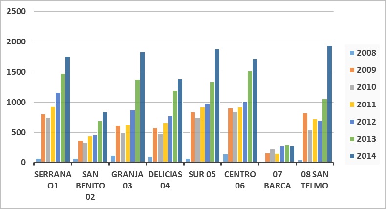 A este incremento significativo del número de solicitudes hay que sumarle el aumento de ayudas sociales, especialmente las de carácter económico, tramitadas por las Unidades de Trabajo Social (UTS), desde el programa de atención primaria de los servicios sociales de Jerez de la Frontera en los últimos años. Estas ayudas sociales han alcanzado una tasa media de variación acumulativa para el periodo 2008-2013 de 156,3% y para el de 2008-2014 de 163,2%, resaltando el considerable incremento de las ayudas en el año 2014 (Gráfico 1).7