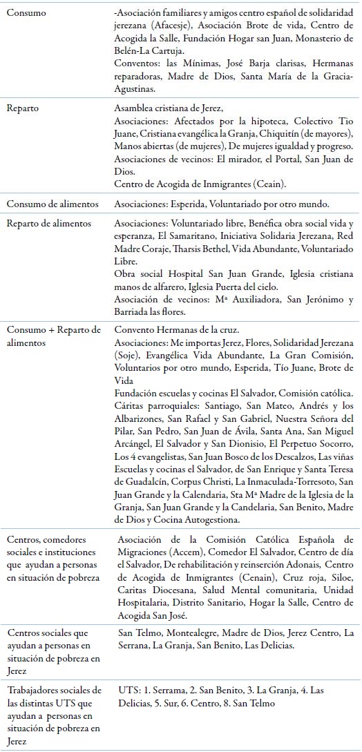 Por una parte, se diseñó una encuesta telefónica10 —siguiendo a Alaminos y Castejón (2006) , Báez (2007) , Díaz de Rada (2009 y 2015), Ortiz e Izquierdo (2009) , Pérez (2009) , Albert y Davia (2011) , Tezanos y Sotomayor (2013) —, destinada a los usuarios de los servicios sociales registrados en el Área de Bienestar Social del Ayuntamiento de Jerez. Por la otra, la información obtenida de parte de los demandantes se complementa con la visión de los oferentes de bienes, servicios y ayudas a personas en situación de precariedad, mediante entrevistas on line a los profesionales del sector vinculados directa o indirectamente con la población en esta situación (Tabla I).11