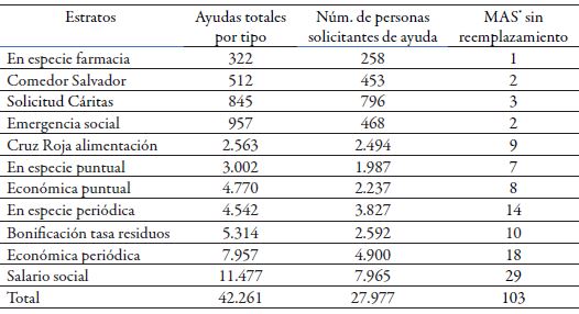 A partir de las baremaciones realizadas con base en el IPREM, se establecen las distintas modalidades de ayudas aplicadas a los solicitantes —asistenciales, de dependencia y económicas, entre otras—. Las ayudas económicas pueden ser en metálico (cheques bancarios y nominativos) o en especie. Las metálicas están comprendidas por la económica periódica, económica puntual y el salario social.8 Entre las ayudas en especie cabe mencionar la de especie en farmacia, especie periódica —la más conocida es el cheque Carrefour— y la bonificación tasa-residuos, que pueden tener carácter periódico o puntual.9