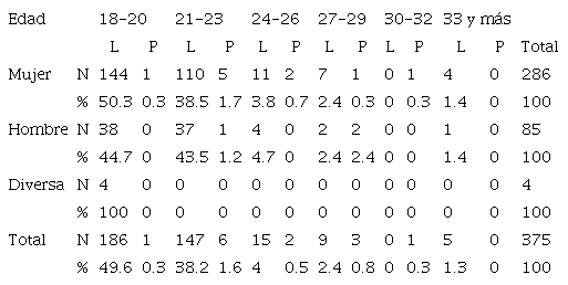 La conformación de la muestra estuvo dada por 375 estudiantes de Enfermería, de los cuales 76.3% fueron mujeres, 22.7%, hombres y 1%, población sexo-genérica diversa. La mayoría de quienes participaron se encontraban en licenciatura (96.5%) y en menor proporción en condición de pasantes (3.5%). Dentro del estudiantado de licenciatura, 81.3% se hallaba entre el segundo y sexto semestre cuando se aplicó el cuestionario, y el rango de edad de la población analizada osciló entre 18 y 23 años (Tabla 1) .
