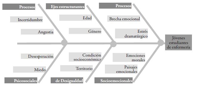 Se emplea la categoría procesos socioemocionales para vincular “el manejo emocional de las personas en función de su posición social estrechamente relacionada con sus identidades de género, sexuales, generacionales, de estratificación social, educativas y sus situaciones vitales” (Morales Romero and López Sánchez, 2020) , determinadas por la construcción de una subjetividad normativa. Esta herramienta heurística permite identificar cómo se vinculan las condiciones psicosociales del estudiantado de Enfermería durante el confinamiento sanitario generado por la Covid-19, los cambios en las condiciones de vida, los escenarios de incertidumbre-preocupación y las afectaciones emocionales por el cierre de las universidades durante la pandemia. A partir de dicha categoría se puede articular la vida emocional de las personas en función de los ejes de estructuración social, sin dejar fuera sus condiciones vitales/biográficas para mostrar que la vida emocional es también una configuración cultural y no sólo individual.