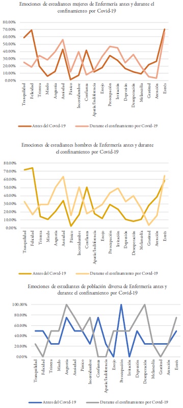 Los estados emocionales habituales antes y durante el confinamiento reportados por el estudiantado variaron y se vivieron de manera diferenciada entre mujeres, hombres e identidad sexo-genérica diversa. Pero en los tres grupos la emoción que permaneció constante fue el estrés, disminuyendo apenas 2.13% del estrés sentido antes del confinamiento y la apatía e indiferencia que incrementó 2.4%. El estudiantado en promedio dijo haber sentido por lo menos cinco estados emocionales previo a la pandemia y seis durante ella; para la población diversa esto aumentó a ocho y nueve estados, respectivamente.