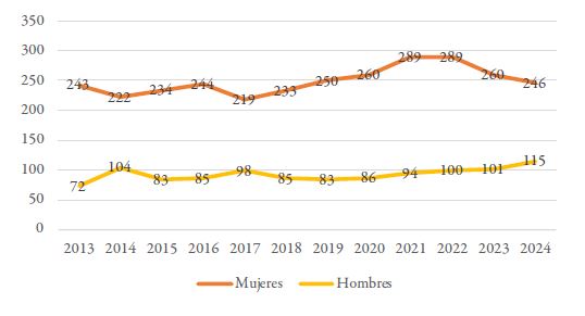 El régimen emocional del campo de la salud también produce y reproduce desigualdades de género (Castro, 2014). En enfermería, las relaciones patriarcales han subvalorado, precarizado y feminizado su objeto de estudio: el cuidado. Lo anterior se ve reflejado en la matrícula universitaria con una mayoría de estudiantes mujeres y en el sistema de salud donde 86% de su personal también es femenino (véase Gráfica 2); además, por la brecha salarial y otras formas de discriminación de género en el entorno laboral, como su limitada participación en puestos directivos (Organización Mundial de la Salud, 2020; Organización Mundial de la Salud y Organización Panamericana de la Salud, 2022).