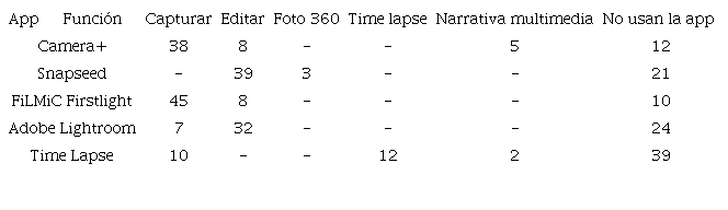 Como tercera sección se tiene el trabajo profesional en fotografía. En este rubro, de los 57 profesionales que desarrollan fotografía con su smartphone, 11 refirieron emplear más de cinco apps para desarrollar su labor profesional, 13 usan entre cuatro y cinco aplicaciones, 18 entre dos y tres apps, y 15 sólo utilizan una app. La Tabla 11 muestra las aplicaciones de fotografía más empleadas por los periodistas encuestados y las funciones que desarrollan con ellas. Otras de las aplicaciones que también refirieron usar en un menor número son: Focos, Quik, ProCamera, Hipstamatic y Reeflex. Al consultarles las razones por las cuales emplean dichas apps, 45 manifestaron que era por contar con varias funcionalidades (larga exposición, retoque, estilización), 28 porque hacen que las imágenes sean más atractivas, 31 debido a que son fáciles de usar al ofrecer una gran paleta de instrumentos, 23 señalaron que las apps de edición son mejores que las de la cámara integrada, y 25 debido a que dichas aplicaciones les ofrecen un mejor control.