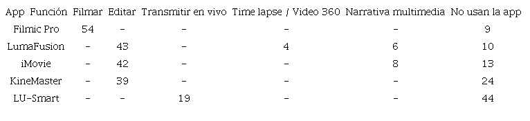 En la cuarta sección se tiene el trabajo profesional en video. En este campo, de los 61 periodistas que desarrollan contenido de video, 18 refirieron emplear más de cinco aplicaciones para desenvolverse en su trabajo, 16 utilizan entre cuatro y cinco apps, 22 entre dos y tres apps, y cinco únicamente usan una aplicación. La Tabla 2 muestra las apps de video más usadas por los participantes de la encuesta y las funciones que desarrollan con ellas. En una menor medida, otras de las apps que también mencionaron son: Cinema FV-5, Hyperlapse, MoJoPro, CapCut y Videoleap. Al consultarles los motivos por los que utilizan aquellas apps, 35 indicaron por la capacidad de disparar en formatos no admitidos por aplicaciones nativas, 28 por un mejor control del aplicativo, 37 debido a la variedad de herramientas, 42 mencionaron que les mejora la calidad del video, y 16 porque les permite desarrollar más rápido su trabajo.