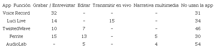 Para la quinta sección se tiene el trabajo profesional en audio. En esta plataforma, de los 44 periodistas que trabajan audio con su teléfono inteligente, seis dijeron usar más de cinco aplicaciones para realizar su labor, siete emplean entre cuatro y cinco apps, 22 entre dos y tres aplicaciones, y nueve solamente usan una app. La Tabla 3 muestra las apps de audio más usadas por los profesionales encuestados y las funciones que desarrollan con ellas. Otras de las aplicaciones que también indicaron utilizar en ocasiones son: Auphonic, Mikme, Dictation, Spreaker Studio y ShurePlus MOTIV. Al preguntarles las razones por las que usan estas apps, 27 mencionaron por la integración con otras apps, 32 porque mejora la calidad del contenido grabado, 23 por la variedad de herramientas, 38 por la facilidad de su uso, y siete por la transferencia inmediata a la radio.