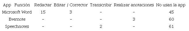 En la sexta sección se consultó sobre el trabajo profesional en texto/redacción. En este rubro, de los 11 periodistas que expresaron haber trabajado texto/redacción con su dispositivo móvil, ninguno refirió usar cuatro o más aplicaciones para desarrollar este trabajo, ocho emplean entre dos y tres apps, y tres únicamente utilizan una app. La Tabla 4 muestra las apps de texto/redacción más empleadas por los periodistas y las funciones que ejecutan con ellas. Al ser pocos los periodistas que emplean este formato, tres indicaron usar esporádicamente las apps Notability y Grammarly Keyboard. Al consultarles los motivos por los que utilizan estas apps, diez mencionaron la facilidad de usar el mismo archivo en el smartphone y la computadora, cinco que pueden avanzar su texto mientras se dirigen a su centro de labores, tres por la corrección y envío rápido de la información, tres porque tienen mejor organizados sus documentos, y dos debido a que facilita el trabajo por la versatilidad de la aplicación.