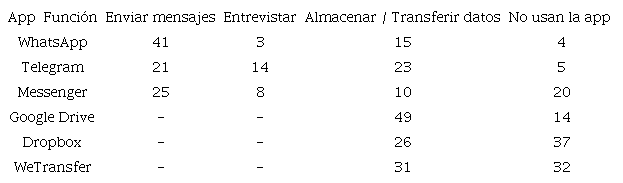 En la séptima y última sección de la encuesta se consultó sobre el trabajo profesional en comunicación/almacenamiento. En este campo, de los 62 periodistas que trabajaron comunicación/almacenamiento con su smartphone, 18 señalaron usar más de cinco apps, 21 emplean entre cuatro y cinco apps, 15 entre dos y tres aplicaciones, y ocho solamente usan una app. La Tabla 5 muestra las aplicaciones de comunicación/almacenamiento más empleadas por los periodistas y las funciones que desarrollan con ellas. Otras de las apps que también mencionaron usar de manera ocasional son: Snapchat, Skype, Microsoft OneDrive, Nextcloud y SwissTransfer. Ante la pregunta de las razones por las que usan estas aplicaciones, 57 manifestaron que las emplean porque son apps que muchas personas tienen en su smartphone, 51 por la inmediatez de la comunicación, 60 señalaron la eficiencia para la recuperación de datos, 42 por la seguridad en la transferencia de información, y 59 debido a su facilidad de uso.