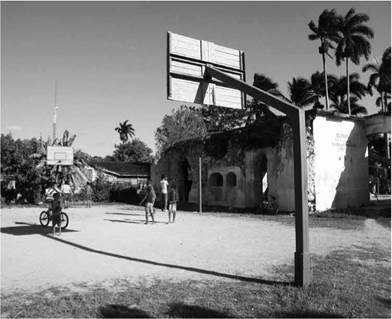Unos niños juegan baloncesto en un campito al lado de las ruinas de la casa del antiguo dueño del ingenio, don Julián Zulueta. En un costado de la fachada sin techo se percibe un rótulo casi borrado por el tiempo y cubierto por enredaderas; en la pared lateral se lee en letras grandes: “Ruinas de la casa de Julián Zulueta y Amondo, 1850” (figura 1). Asomándonos un poco más se entrevén algunas viviendas, sogas con ropa colgando al sol, que aparecen en lo que era el salón de la antigua casa colonial y que hoy es un silencioso y soleado patio compartido y un pasaje hacia las casas del fondo. Frente a la casa, a un costado del campito de juego, se encuentran una gran rueda y la caldera de la época de los estadounidenses, que funcionaron en el ingenio hasta hace pocos años. Del otro lado de la calle y de la plaza central, la planta del central azucarero se erige en toda su imponencia, con sus altas chimeneas fumantes, los camiones con la caña esperando para descargar y las calderas a todo vapor las veinticuatro horas del día. Es el 31 de diciembre y todo el pueblo está festejando porque va a comenzar la zafra11. Frente al central se encuentra la plaza con su reloj de sol y su glorieta de troncos de árboles. Del otro lado de la plaza y de cara al central está la torre campanario, desde donde se accede a lo que fue el barracón y hoy son viviendas ocupadas principalmente por las familias afrodescendientes, construidas en su mayoría luego de la demolición parcial del barracón en los años setenta12.