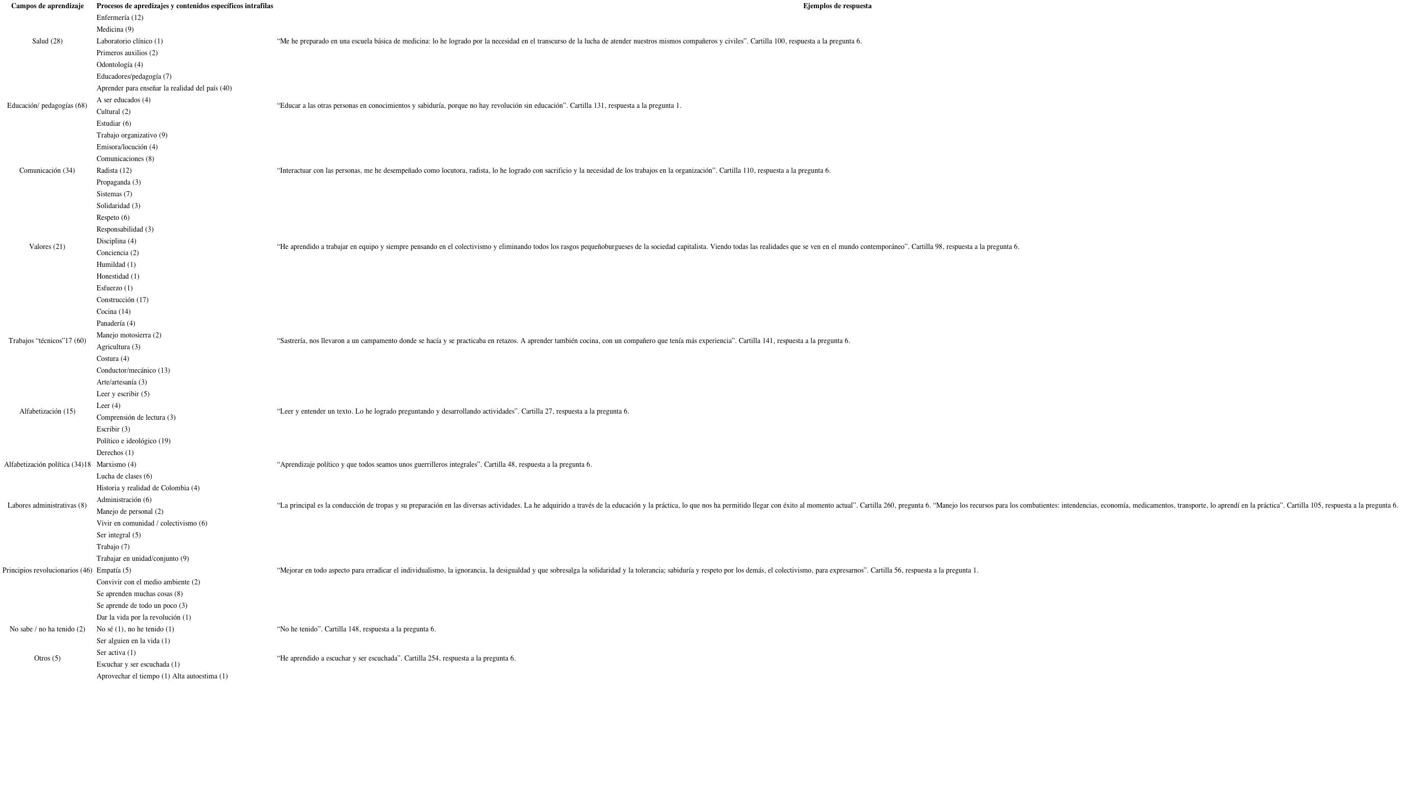 Con el objetivo de explorar las memorias de los aprendizajes propios durante la permanencia en la guerrilla y en el proceso de reintegración iniciado en el 2017, me enfocaré en las respuestas dadas a los puntos 1 (sobre la importancia o el sentido de educarse) y 6 (sobre las habilidades o trabajos aprendidos en la organización FARC-EP) de las 285 cartillas diligenciadas. Estos dos puntos generaron respuestas asociadas a los procesos de aprendizaje. A continuación, presentaré algunos resultados y las conclusiones preliminares que aportan al objetivo de este trabajo. En la siguiente tabla se relacionan tres columnas con categorías y subcategorías émicas, donde el número entre paréntesis indica las personas que las mencionaron. La primera columna es el campo de aprendizaje al que se refirieron los 285 participantes; la segunda presenta las subcategorías usadas para los contenidos específicos de los procesos de aprendizaje mencionados en la primera columna, y en la última, a modo de ejemplo de cada categoría, se reporta un fragmento de lo dicho por los participantes.
