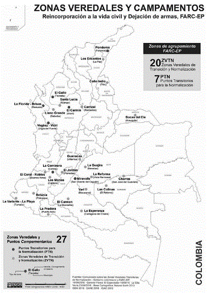 Oficina del Alto Comisionado para la Paz. 2017. "Funcionamiento de las zonas veredales transitorias de normalización (ZVTN) y los puntos transitorios de normalización (PTN)". Consultado el 25 de septiembre del 2019. http://www.altocomisionadoparalapaz.gov.co/procesos-y-conversaciones/Documentos%20compartidos/ABC-Zonas-veredales.pdf