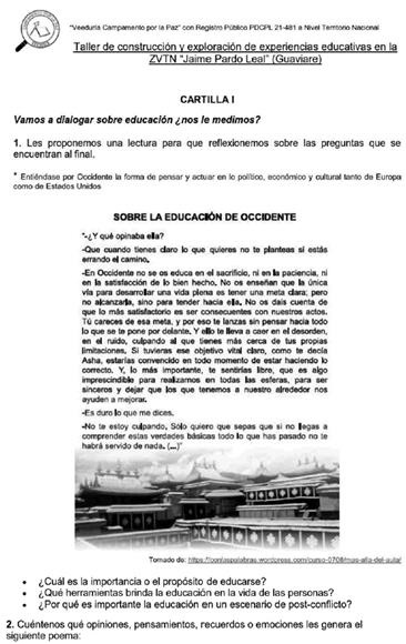 Con este sondeo en mente diseñamos una cartilla pedagógica como instrumento experimental para acceder a esos universos pedagógicos poco o nada conocidos por nosotros. Nuestra idea era construir un escenario en el que estas experiencias de vida y procesos de conocimiento previos a la fase del posconflicto entraran en diálogo con las diferentes miradas que de este lado tenemos sobre la construcción de paz en escenarios educativos colectivos. Para consolidar la herramienta fue necesario, en primer lugar, un diálogo permanente con alias Alejandra, quien ha trabajado durante décadas en procesos de formación y educación desde diversas áreas (artes, escritura, comprensión de lectura y pedagogía), en el contexto del conflicto armado y bajo las condiciones de ilegalidad de la vida guerrillera.