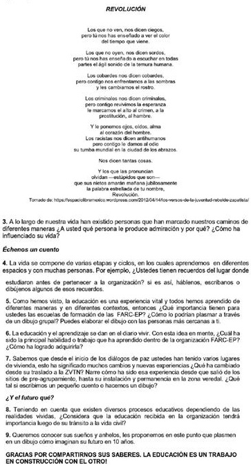 ABSTRACT: This article presents original ethnographic and pedagogical material that contributes -and questions- the official view of pedagogy for peace, an important dimension of the Peace Agreements in Colombia. Through a series of pedagogical workshops conducted in a transitional and normalization zone (ZVTN) in Guaviare with a group of 285 ex-combatants of the Revolutionary Armed Forces of Colombia (FARC) in transit to civilian life, local learning experiences were identified. These experiences reveal a repertoire of knowledge acquired during their permanence in the guerrillas and in FARC's civil transition after signing the peace agreements. Based on the analysis of the working booklets filled in with this group of ex combatants, I argue that it is urgent to broaden the consideration of a pedagogy for peace through the inclusion of a pedagogy from peace.