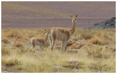 La vicuña (Vicugna vicugna) es una especie silvestre de la familia Camelidae (figura 1). Su hábitat se acota a las provincias biogeográficas Puneña y Altoandina (ca. 3.500-4.800 m s. n. m.) en Perú, Bolivia, Chile y Argentina. Se trata de un animal gregario y territorial que se organiza principalmente en grupos familiares y grupos de solteros. Los grupos familiares (un macho, tres a cuatro hembras y dos crías) tienen un territorio que no supera las 30 ha, dentro de las que se incluyen zonas de descanso, áreas de alimentación y fuentes de agua. Los grupos de solteros (de composición numerosa, variable e inestable) buscan machos de grupos familiares para desafiar, hembras para reproducirse y territorios para dominar (Franklin 1982; Vilá 2012).