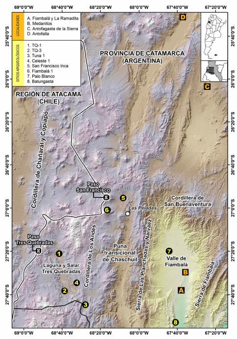 El oeste tinogasteño es una amplia región que se localiza en el sudoeste de Catamarca (Argentina) y abarca unos 13.000 km2, incluyendo ambientes contrastantes como el valle de Fiambalá (1.400-2.000 m s. n. m.) y la puna transicional de Chaschuil (3.500-4.500 m s. n. m.) (figura 2). Su ocupación se inició con las primeras sociedades cazadoras recolectoras (ca. 8000 años a. P.). Sin embargo, la mayoría de los estudios se concentraron en las sociedades agropastoriles, desde las primeras (ca. siglo V a. C.) hasta la conquista incaica (ca. siglos XIV y XV) (Ratto 2013).