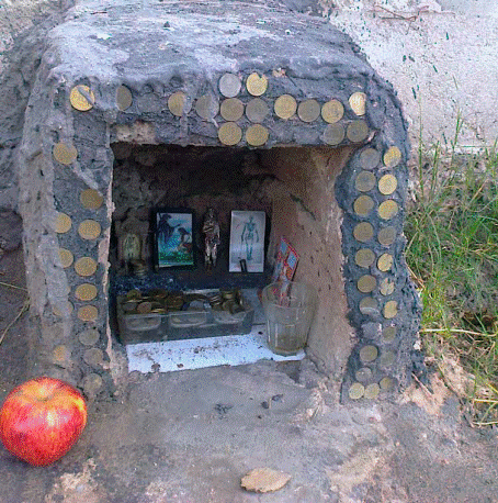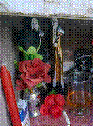 Esa tarde, Iván destapó la gruta y me mostró cómo era por dentro: tenía dos estampitas y dos estatuas pequeñas de San La Muerte y una lámina de Gauchito Gil. Según me han explicado las personas con quienes conversé en La Tela, devotas del primero, ambos santos eran amigos. Más aun, en esa estampita de la gruta de Iván, San La Muerte está bendiciendo a Gauchito Gil. Según me explicó: