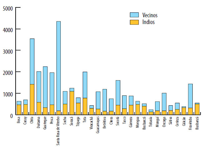 En este punto, el significado también comenzó a variar según si dicha representación se enunciaba en pequeñas aldeas o, por el contrario, en ciudades y villas más tradicionales. En efecto, una cosa era ser vecino y reclamarse como descendiente de los primeros vecinos y otra, ser vecino de un rancherío en crecimiento. Ello tenía que ver, por supuesto, con el tamaño del Estado y con la posibilidad de enrolarse en la función pública. Mientras en las ciudades los vecinos podían aspirar a cargos burocráticos, eclesiásticos o militares, en las pequeñas villas y pueblos apenas podrían "gozar" -relativamente- de la exención tributaria. Las gentes de las pequeñas aldeas entendían las ventajas y desventajas (los usos y funciones) no solo de tal o cual representación, sino también de ser vecino bajo las condiciones de una u otra localidad. Esto se observa en el censo de 1777 (Gutiérrez de Pineda y Pineda Giraldo 1999, 129), en el que se muestra la proporcionalidad demográfica de la población indígena con respecto a los diferentes vecindarios y queda clara la existencia de unos factores que hicieron más atractiva la vecindad en ciertas localidades (Chita, Sogamoso o Santa Rosa de Viterbo).