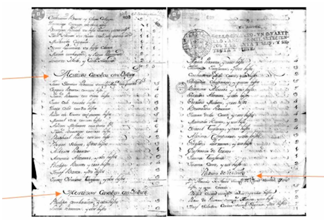 No conviene, empero, homologar la representación social y política del vecino con la representación racial blanco. Incluso, tampoco conviene su homologación con el referente mestizo que, en las ciudades, había abandonado su relacionamiento con los factores religiosos y había adoptado rasgos claramente biopolíticos (Castro-Gómez 2005). Fue entonces cuando se comenzó a dibujar una diferencia entre los vecinos de las grandes ciudades y el vecino parroquiano de las pequeñas aldeas y villas. El análisis del censo de José María Campuzano y Sanz permite ver que vecinos y mestizos eran representaciones excluyentes: o se era vecino o se era mestizo -a menos de que se tratase de un propiamente mestizo (o un mestizo limpio)-. Las razones tienen que ver más con la práctica social concreta que con las convenciones discursivas o ideológicas. El matrimonio de vecinos con indios y, en mayor medida, con indias -quienes en las sociedades matrilineales transmitían la herencia, filiación y sucesión- podría anular los derechos de uso del resguardo; a contrapelo, los hijos de un matrimonio india/ vecino -por cuenta de filiaciones matrilineales- podrían beneficiarse del uso de tierras del resguardo e incluso acceder a otros "privilegios" derivados de la filiación y la sucesión indígena. Así, por ejemplo, un documento de 1795 muestra que en Gachetá se intentó obligar a pagar requinto a unos vecinos por el hecho de estar casados con indias (AGN, Tributos, sc. 60, leg. 16, doc. 20). En todo caso, la doble condición indio/vecino no parece haber sido admitida.