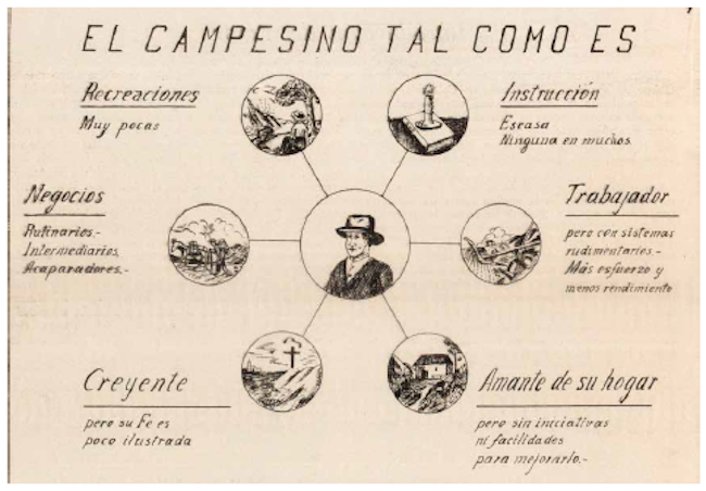 Rojas Pinilla también intentó robustecer la relación directa del estado con la población rural mediante el fortalecimiento y la creación de instituciones y programas. En su gobierno, la expresión campesino caracterizó a una clase ubicada en uno de los polos de los conflictos agrarios en que el estado intermedió a través de la Dirección de Asuntos Campesinos. En el decreto que le dio origen, se usó campesino como equivalente a trabajadores agrícolas, incluyendo bajo esta última categoría a ocupantes, colonos, arrendatarios, aparceros y similares, mientras la otra parte fue designada con el término propietario. Así, bajo la forma de una legislación dirigida a defender los derechos de la "clase campesina" (Decreto 212 de 1953), la norma legitimó su desposesión naturalizándola. Al mismo tiempo, la categoría campesino nombró a la población objeto de políticas de educación y salud rural en manos de la División de Seguridad Social Campesina (Decreto 2214 de 1953) y de la Campaña de Educación Campesina (Decreto2419 de 1953). Esta última se apoyó en las escuelas radiofónicas de la fundación católica Acción Cultural Popular (ACPO) y en la revista Colombia Campesina del Ministerio de Educación. A través de ambos medios, la población rural fue interpelada como campesina desde el estado y la iglesia católica, y representada desde la carencia (figura 2), pero también como la base del progreso y la identidad nacional. A su vez, tales medios sirvieron como plataforma de una campaña para la adopción de insumos en el marco de la Revolución Verde y para rechazar al comunismo. Así, las tres miradas sobre el campesino presentes en la República Liberal -clasista, racializada y folclorizante- se extendieron a este periodo. Estas, como vimos, se combinaron con una cuarta que lo veía como un sujeto inclinado hacia la violencia ligada al discurso contrainsurgente.