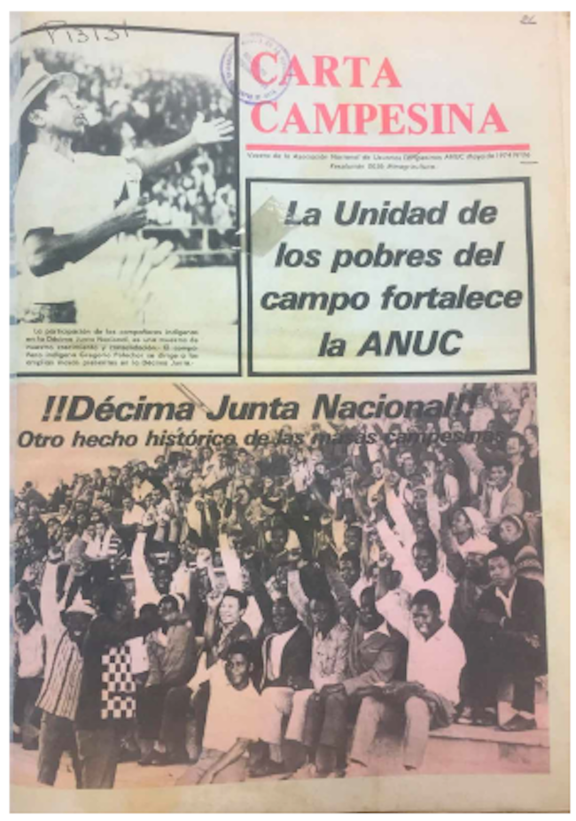 La ANUC por una Reforma Agraria Integral y democrática; por la reivindicación del trabajador agrícola, por la elevación de su nivel de vida económico, social, cultural, y el desarrollo pleno de sus capacidades y que entiende que para superar el atraso económico del país y lograr el bienestar general del pueblo colombiano es necesario romper las actuales estructuras de dominación internas y externas que han beneficiado a una reducida clase explotadora, mediante la lucha organizada y permanente del campesinado colombiano con la clase obrera y demás sectores populares comprometidos con el cambio estructural y la liberación total de nuestra patria de toda forma de dominación y coloniaje. (ANUC 1974, 11)