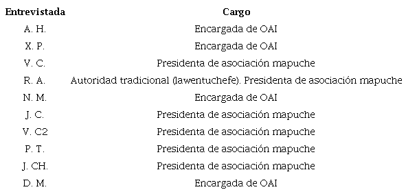 En términos metodológicos el artículo es resultado de una investigación exploratoria-cualitativa. Las principales técnicas utilizadas fueron la observación participante y la entrevista en profundidad. Se entrevistó a diez mujeres mapuche seleccionadas por medio de un muestreo opinático de variedad máxima (Ruiz Olabuénaga 2012). Dada la amplia diversidad de liderazgos observada, se favoreció la heterogeneidad de las participantes: mujeres de distintas generaciones, con distintos años de trayectoria política, que tuvieran distintos roles en la organización urbana y se vincularan con los gobiernos locales (véase tabla 1). Para el análisis de la información se triangularon las notas de campo con las entrevistas transcritas. Para identificar a las mujeres entrevistadas en las citas del texto, junto a una breve reseña de su perfil, utilizamos una identificación ficticia para resguardar el anonimato acordado en la carta de consentimiento informado.
