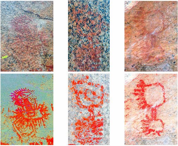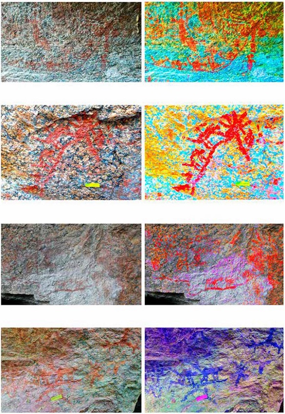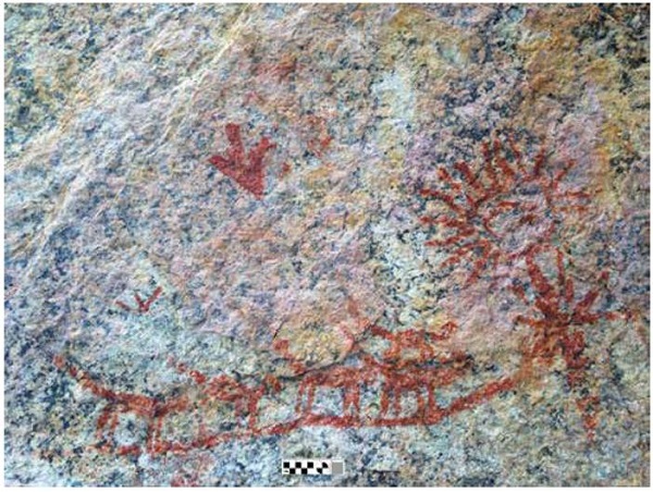 Los distintos registros iconográficos de la canoa y la palmera solar fueron realizados con pigmentos que van del color rojo-anaranjado al color rojo intenso. Observamos algunas variaciones entre ellos, como, por ejemplo, la cantidad de “tripulantes” de la “embarcación” -observamos seis, cinco, cuatro, tres y dos figuras en las distintas iconografías-; en algunos casos, la primera figura que se enfrenta a la palmera, a nuestro juicio, parece llevar a sus espaldas una pequeña figura similar, como si fuese una cría (lo cual sí podría indicar que se trata de monos, debido a la forma en que estos animales transportan a sus crías). Otra variación puede notarse en la “copa” de la palmera, que a veces recuerda la forma de un sol (con un círculo y rayos o solo con rayos), o la presencia o ausencia de “semillas” (primer registro de la figura 3). Esto podría sugerir que los registros fueron realizados en momentos o por personas distintas. Pero en todos los casos observamos una consistencia en los siguientes elementos: una línea horizontal debajo de las figuras, que interpretamos como una canoa, con tripulantes cuadrúpedos con colas largas (probablemente mamíferos), los cuales se dirigen hacia lo que podría interpretarse como una “palmera solar”, ubicada en el extremo derecho de la embarcación.