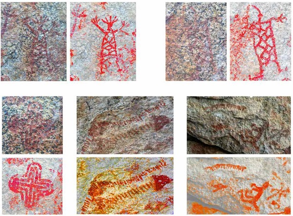 De acuerdo con Bahn (2010), se hace imposible determinar de manera inequívoca las figuras que se observan en este abrigo, puesto que las lógicas visuales y las concepciones de mundo a partir de las cuales pudieron ser realizadas posiblemente se basen en formas muy distintas de concebir y representar la realidad o el mundo supranatural. Sin embargo, desde una perspectiva contemporánea se pueden observar diversas figuraciones e incluso temas iconográficos que cabría interpretar como figuras antropomorfas que a veces aparecen con objetos como lanzas; cadenas de figuras; grupos de figuras; figuras zoomorfas que incluyen insectos como ciempiés y arañas; batracios y serpientes; mamíferos, como perezosos, monos y murciélagos; y aves o seres zoo-antropomorfos con forma de humano y de pájaro (figura 6). Observamos asimismo representaciones geométricas, como por ejemplo formas que podrían recordar la imagen de dos soles unidos o de un sol y una luna, la forma de una cruz concéntrica, líneas en forma de grecas, zigzag, figuras romboides, sucesión de líneas paralelas, etc.
