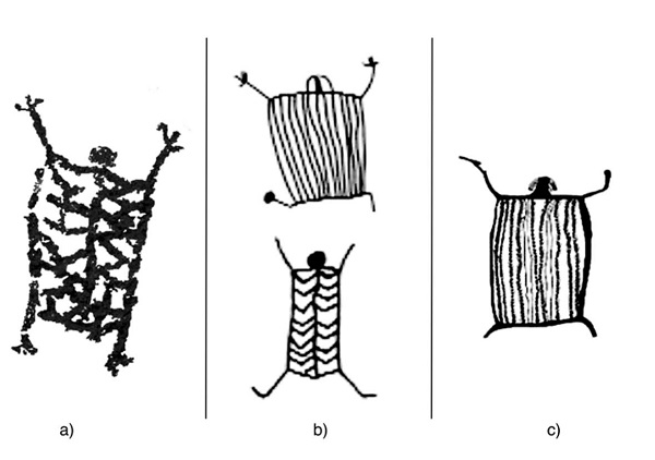 Un elemento notorio del abrigo de Punta Brava es la presencia de iconografías que muestran figuras humanas con cuerpos rectangulares o triangulares, rellenados con líneas y/o puntos (figura 7). Estas figuras aparecen en distintas cuevas encontradas a lo largo del Alto y Medio Orinoco, e incluso en pinturas rupestres de regiones mucho más lejanas, como las de Chiribiquete, en los departamentos colombianos de Caquetá y Guaviare (Castaño Uribe 2017; 2015).