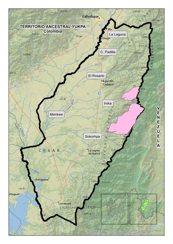 Su territorio en Colombia abarca la vertiente occidental de la serranía de Perijá, en la frontera colombo-venezolana (Figura 1). Se distribuye en seis resguardos legalmente constituidos: tres de ellos ubicados en el municipio de La Paz (Caño Padilla, El Koso y Rosario), dos en Agustín Codazzi (Iroka y Menkwe) y uno en Becerril (Sokorpa). Particularmente, el resguardo Iroka fue constituido en 1976 con 8 678 hectáreas, en su mayoría sobre bosques de reserva y tiene hoy la mayor población: 3 000 personas, distribuidas en cerca de 600 familias. A Iroka lo componen 64 asentamientos, agrupados en ocho sectores pequeños con afinidades filiales e históricas, varios de ellos localizados fuera del área de resguardo (Resguardo Iroka y Secretaría de Educación del Cesar 2018).