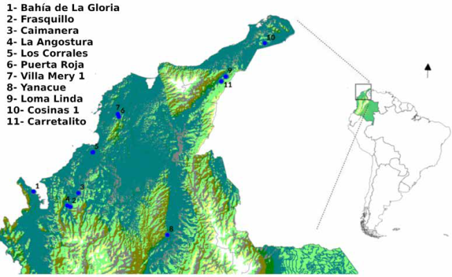Por otra parte, en exploraciones de rescate arqueológico realizadas durante la primera década del siglo XXI, se reportó el hallazgo de una punta bifacial en las terrazas aledañas al río Ranchería, en el departamento de La Guajira, en el sector de Loma Linda (Ingetec 2005). En el informe se menciona la similitud de esta punta con aquellas halladas en Venezuela, conocidas en la literatura arqueológica como puntas El Jobo, pero no se ofrecen características técnicas o registros fotográficos que corroboren la información. Estos hallazgos indican que diferentes ambientes en Colombia fueron habitados y que la costa caribe no pudo ser la excepción. Este conjunto de información sugiere que hacen falta más investigaciones encaminadas a la detección de estos sitios y que, por tanto, la ausencia de ellos puede responder a un sesgo metodológico (en la figura 1 se presenta la ubicación de los sitios mencionados).