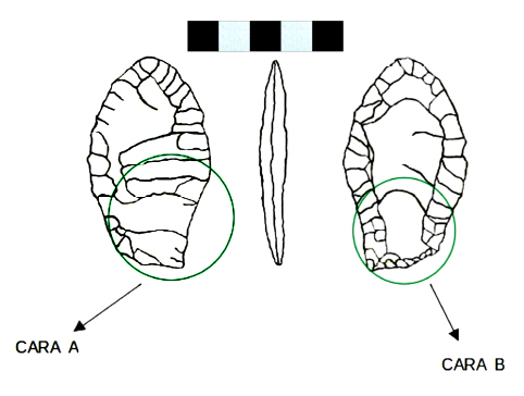 El ancho y la extensión de los lascados indican que el objeto se realizó mediante retoques extendidos y parcialmente extendidos para formatizar la pieza. También se usó la técnica de adelgazamiento para lograr el espesor de la sección transversal. Se hace esta afirmación de acuerdo con las clases técnicas de adelgazamiento y reducción propuestas por Aschero y Hocsman (2004), ya que es posible ver sobre las caras lascados que se extienden desde el borde hasta un poco más allá del centro del artefacto, algunos de los cuales se superponen a los negativos provenientes del margen opuesto (véase figura 4); debido a este tipo de lascados, no es posible identificar la forma base utilizada para elaborar este artefacto. En cuanto al pedúnculo, sobre la cara que en la figura 4 se denomina con la letra B, es visible un acanalamiento, y, aunque se advierte una fractura en el extremo del pedúnculo, en la parte restante es posible ver un adelgazamiento de la base del pedúnculo mediante retoques.