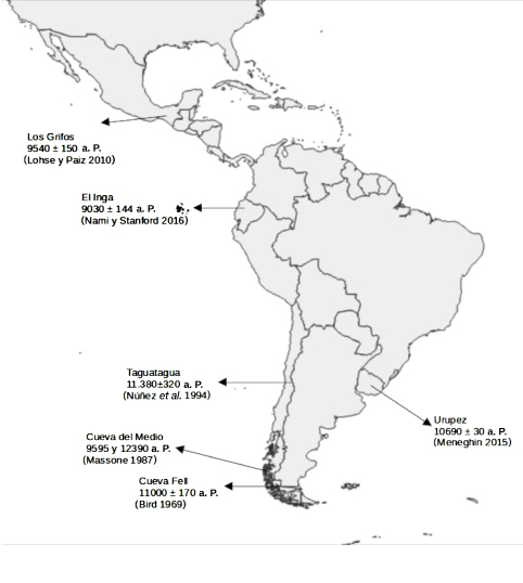 A lo largo de Latinoamérica se han reportado múltiples sitios donde se hallaron puntas cola de pescado, pero son pocos los sitios con fechados absolutos (véanse algunas excepciones en la figura 6). Las investigaciones han relacionado estas puntas con los procesos de poblamiento del Pleistoceno tardío y el Holoceno temprano, y han propuesto la posibilidad de que indiquen un pasado cultural común (debido a las similitudes entre los artefactos y a su dispersión por el continente) o de que se trate de invenciones independientes en cada región (véanse Castiñeira et al. 2011; Nami 2021; Nami y Stanford 2016; Suárez 2017). Como se puede ver en la figura 6, este tipo morfológico de punta se distribuye ampliamente a lo largo de Sudamérica y, en menor medida, de Centroamérica, lo cual demostraría la relevancia de seguir investigando al respecto para lograr una mejor comprensión de los procesos de poblamiento de nuestro continente.