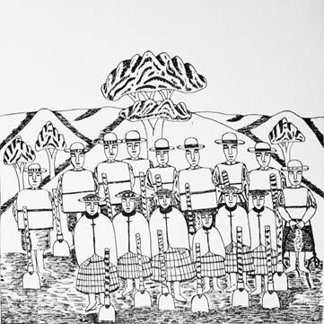 En la imagen de Tumiñá (figura 1) se puede apreciar dos filas de personas, las mujeres en frente de la línea de hombres, todos con palas paradas en el suelo; el hombre que carga el khipu (la cuerda) a mano derecha está posicionado entre las dos filas. Al igual que en sus apuntes sobre el velorio, donde Tumiñá identifica por nombre a la fallecida, en su dibujo de la minga su pluma distingue entre los participantes en el evento, representándolos con sus diferentes estaturas y con facciones distintas. Hernández, en cambio, descontextualiza la actividad, la hace genérica, transformando a las personas representadas en tipos, como hacía la etnografía convencional del siglo XX y como hace Rowe en su artículo sobre Guambía.