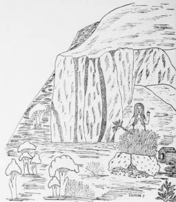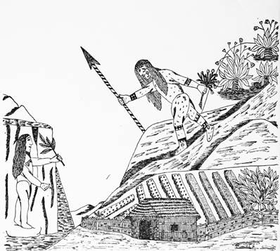 Hernández organiza la historia de doña Manuela en dos capítulos que reproducen algunas de las oraciones del relato original, enmarcadas por textos compuestos por el antropólogo. Asimismo, invierte el orden de los relatos: en Namuy misag, el primero es sobre la invasión española y el segundo, sobre la llegada de los pijaos. Hernández se inserta en el primer capítulo como uno de los oyentes de la narración: “La vieja Cayetana está hablando la historia de la mejor mujer que ha sido madre de esta gente de Guambía” (Hernández de Alba y Tumiñá Pillimué [1949] 2019, 125). En estos capítulos, el autor del texto y el dibujante no siempre coinciden en sus interpretaciones del escenario. Mientras que Hernández coloca a los españoles en el primer plano, Tumiñá los ignora por completo, prefiriendo centrarse en la figura de doña Manuela (figura 2), a quien pinta como una mujer desnuda, con pelo largo, un ramo de lechero agarrado en la mano, que está parada sobre una piedra debajo de la cual hay un rebaño de animales pequeños al lado de una pequeña choza y una enorme peña. El recuento de Hernández de la confrontación de doña Manuela con los pijaos replica algunas de las frases del original, pero en una versión muy resumida (Hernández de Alma y Tumiñá Pillimué [1949] 2019, 127). En cambio, el dibujo de Tumiñá (figura 3) contiene una gran riqueza de detalles: un enorme pijao, desnudo, de pelo largo, lanza en mano, viene bajando la montaña, mientras por detrás brotan dos frailejones: son los compañeros del guerrero, a quienes doña Manuela había transformado en plantas; debajo del pijao está una casa de paja con sembrados cuidadosamente cultivados en surcos, que representan el territorio que doña Manuela defiende. En este dibujo, Tumiñá traza una distinción entre la barbarie de los pijaos y la civilización de los misak, encasillando múltiples referentes en una sola imagen.