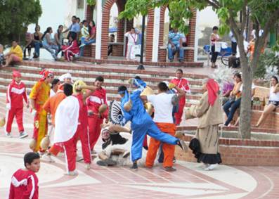 Luego de un breve descanso, inicia la correteada. Los más entusiastas vuelven a bajar las máscaras de la cabeza a la cara y empiezan a buscar a los toreadores que suelen asomarse por las esquinas del parque, aunque, a diferencia de otros momentos, en los últimos años la correteada se realiza en el parque mismo, en el que se hace una especie de círculo de matachines al que entra el toreador en un acto de auténtico masoquismo (figura 21). Los matachines con trajes más grandes se quedan sentados a la sombra de los árboles para seguir hidratándose. En algunas ocasiones el barrio organizador realiza una especie de show en la tarima del parque; estas presentaciones suelen ser las parrandas más recordadas y por lo tanto las más exitosas. El éxito consiste en divertir a la gente y hacer que se ría para que diga que la parranda estuvo buena.