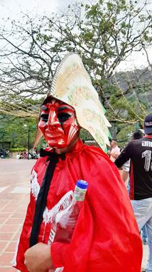 El abandono del anonimato parece tener un origen político. En tiempos de la violencia bipartidista (de la cual Capitanejo fue un cruento escenario), el anonimato del matachín era aprovechado para saldar rencillas políticas y era frecuente que las parrandas dejaran como consecuencia un par de apuñalados. Actualmente, la cara descubierta parece ser una promesa tácita de no agresión -más allá de los golpes de la vejiga-. Ahora la careta se conserva durante la mayoría del tiempo del desfile, aunque el calor infernal que se respira debajo obliga a muchos matachines a ponérsela sobre la cabeza, como si se tratara de una cachucha (figura 28). Una vez llegados al parque, la mayoría se quitan la máscara por completo.