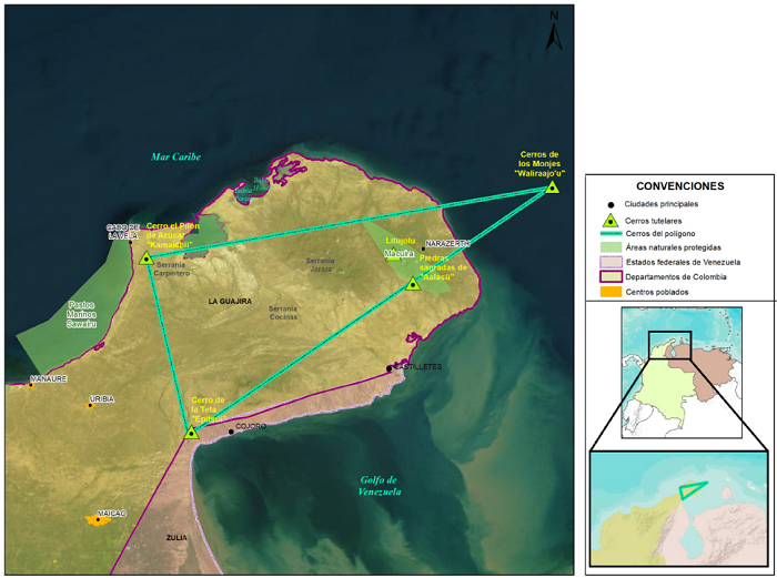 Los cerros tutelares para los wayuu son Epitsü o cerro de la Teta, hito fronterizo entre Colombia y Venezuela -aunque en jurisdicción del primero-; Iitolujo o serranía de la Makuira en Colombia, donde se suele situar el origen wayuu; Kamaichi o Pilón de Azúcar en el cabo de la Vela, que ahora hace parte de Colombia, pero que durante un tiempo fue parte de la Capitanía General de Venezuela, y los cerros de Los Monjes, llamados también Waliraajo’u, ubicados en Venezuela (figura 2). Estos cerros forman un triángulo que construye la geografía mítica y humana de la historia territorial wayuu y son recordatorios de una relación que se restaura cíclicamente (Guerra 2019; Riaño, Guerra y Moreno 2020). La temporalidad de la nación wayuu tiene como base el reconocimiento de sus hitos geográficos, asociados a espacios con relevancia espiritual.