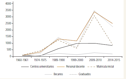 Ese proceso se refleejó en un acceso amplio y diverso a las aulas del nivel terciario, que dio lugar a una multiplicación de la matrícula en 4,3 veces y de los graduados en 2,4 veces, al tiempo que el personal docente creció en 3,4 veces (figura 1). Es decir, la educación superior en este periodo se convirtió en la principal vía de movilidad social ascendente, en la que se conjugaba ascenso en el estatus social y en el nivel socioeconómico, y se convirtió en elemento central de la subjetividad individual y colectiva: reforzó su significado en la escala de valores de la población, ocupó el lugar principal en la estructura de aspiraciones de los grupos juveniles y sus familias; los logros alcanzados en esa esfera fueron fuente de satisfacción individual, al tiempo que la educación fue el centro de las políticas públicas dirigidas a las juventudes y sus éxitos contribuyeron al fortalecimiento del orgullo nacional (Domínguez, 1994).
