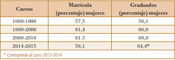 Desde 1982 las mujeres sobrepasaron el 50 % de la matrícula de nivel superior (CEE, 1985: 487-488) y al finalizar ese decenio representaban el 57 % (ONE, 1996: 298). La concentración de mujeres estaba asociada con factores contradictorios. De una parte, un entramado social que potenciaba —tanto desde las políticas sociales como desde el discurso político— la igualdad de la mujer, lo que en un contexto que confería alto valor a la educación superior significaba acceder a esta como vía para el logro de la emancipación y de un estatus social de plena igualdad. Al propio tiempo, la reproducción de roles sexistas tradicionales, según los cuales las familias y la propia escuela exigen de las niñas comportamientos más dóciles y disciplinados, contribuyeron a que ellas describieran trayectorias educativas más exitosas que les garantizaban una mejor ubicación en un sistema de selección meritocrático.