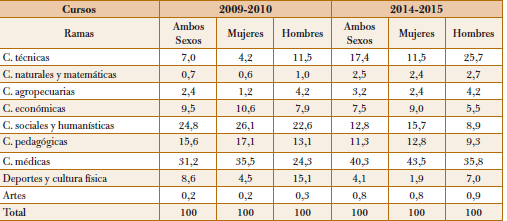 A esta ligera disminución de las mujeres deben haber contribuido los cambios en la estructura de la matrícula por tipos de carreras, pues a pesar del predominio femenino en prácticamente todas las especialidades, aún se dan diferencias de sexo-género en la preferencia de unas y otras. Así, la mayor reducción (a la mitad) se produjo en ciencias sociales y humanísticas y en las deportivas, junto a decrecimientos más leves en las pedagógicas y económicas, casi todas de mayor presencia femenina. Mientras, los aumentos se dieron en las ciencias naturales y exactas y en las agropecuarias y los crecimientos más relevantes en las carreras tecnológicas y especialmente en las de ciencias médicas (tabla 2).