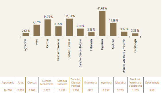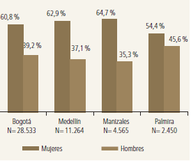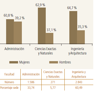 De acuerdo con el Sistema Nacional de Información de la Educación Superior (Snies), en el primer semestre del 2013, del total de personas matriculadas, el 52,5 % fueron mujeres y el 47,5 % hombres. Al desagregar los datos de matrícula según área del conocimiento, las mujeres se concentran en mayor proporción en economía, administración, contaduría y afines con el 36,7 %, seguido de las ciencias sociales y humanas con el 18 %. En contraste, en el mismo periodo académico, los hombres se concentran en mayor proporción en ingeniería, arquitectura, urbanismo y afines con el 39,9 %, seguido de economía, administración, contaduría y afines con el 26 %.