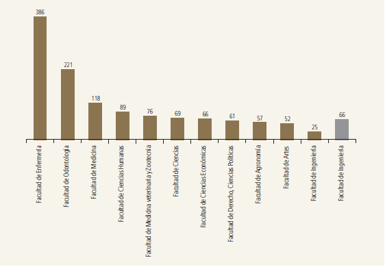Luego de esto, todas las demás facultades presentan índices de feminidad bajos, los cuales indican una minoritaria participación de mujeres en éstas. Así, por debajo o igual al índice de feminidad de la Sede (66) se encuentran las facultades de Ciencias Económicas, Derecho y Ciencias Políticas, Agronomía y Artes (figura 10). Por último, la facultad con menor concentración femenina es la de Ingeniería con 25 mujeres por cada 100 hombres.
