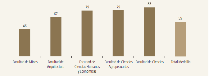 El carácter “mixto” de estas tres facultades en la Sede Medellín se puede corroborar por un análisis según el índice de feminidad. La Sede en su conjunto arroja un índice de 59 mujeres por cada 100 hombres (figura 12). Aquí, la Sede en su conjunto no podría considerarse como “mixta”, pues es clara la mayoría masculina. Así mismo, por debajo de esta medida se encuentra únicamente la Facultad de Minas, con 46 mujeres por cada 100 hombres. Cabe señalar que este índice se encuentra por encima de aquel registrado en la Facultad de Ingeniería de la Sede Bogotá que es de 25. Esta última presenta entonces una segregación masculina más alta a pesar de la similitud en el tamaño absoluto de ambas facultades, con cerca de 6 200 estudiantes cada una.