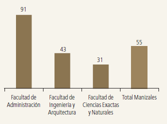 Esta descripción se afina y corrobora al tener en cuenta el índice de feminidad para la Sede de Manizales y sus tres facultades (figura 14). En esta Sede se registra un índice de feminidad de 55, esto es 4 y 11 puntos menor que los índices registrados en Medellín y Bogotá, respectivamente. La Facultad de Administración presenta una cuasi total paridad entre los dos grupos, pues por cada 90 mujeres hay 100 hombres. Las otras 2 facultades relejan una concentración masculina bastante marcada, por debajo del índice total de la Sede Manizales. La Facultad de Ciencias Exactas y Naturales de esta Sede presenta uno de los índices de feminidad más bajos de toda la Universidad.